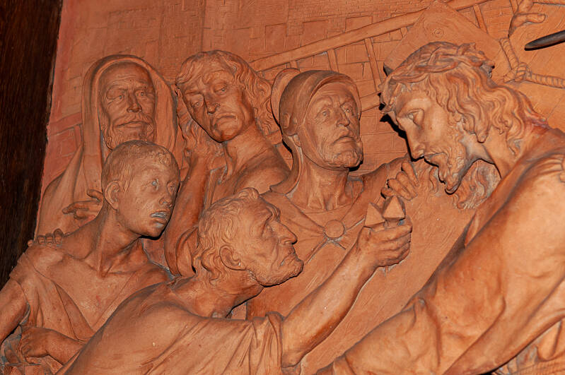 Hier en verderop: details van de KRUISWEG van Jules Vits, onovertroffen, vooral de laatste staties zijn aangrijpend, pakkend. Ik wou de vele ACHTERGRONDFIGUREN oplichten.