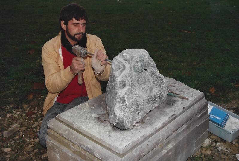 Marc De Buck, begin de jaren 1990 aan het beeldhouwen in het ovenveld.