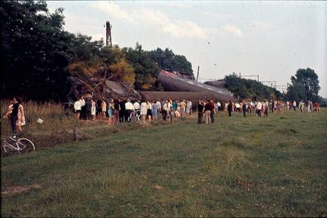 De treinbestuurder reed te snel over de wissel en de trein ontspoorde, 1970, Kalverhage, ter hoogte van familie DE ROO-VERGAERDE, paardenliefhebbers.